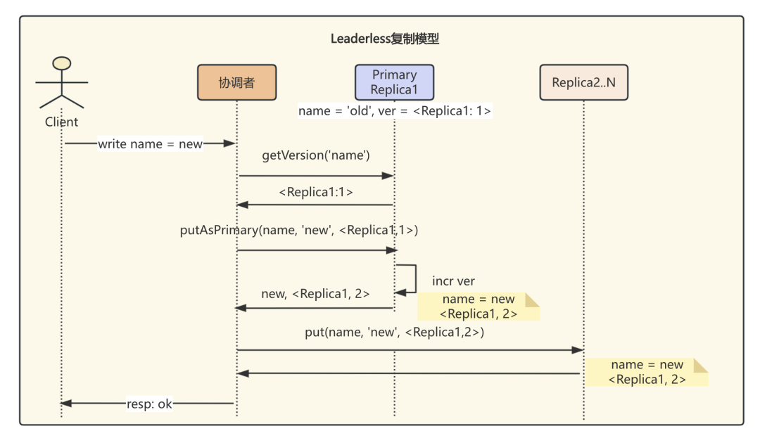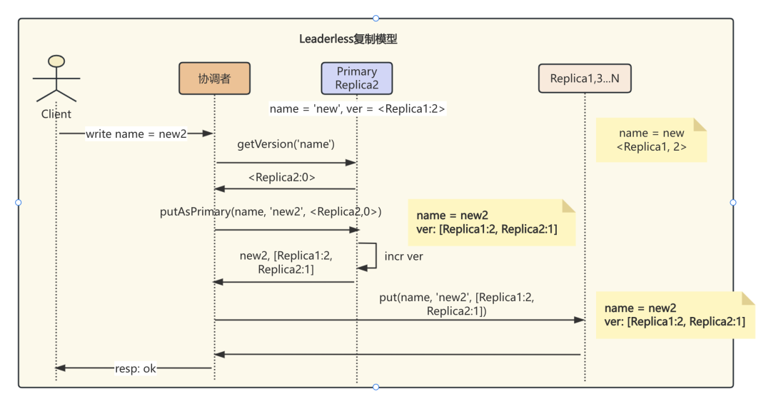 从上述我们引入一个协调者的身份目的是为了将内部的version信息获取细节屏蔽,仅提供对外客户端写入的API操作, 在上述流程中Replica1当选为key = name 的集群“主节点”, 整个过程中key = name 对应于版本<Replica1, Version> 上是具备单调递增, 类似于前面讲述到Lamport Clock写入流程, 通过primay获取版本, 然后再携带版本进行进行putAsPrimary写入, 这个我们的Primary节点需要进行版本更新并返回给协调者节点.