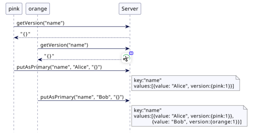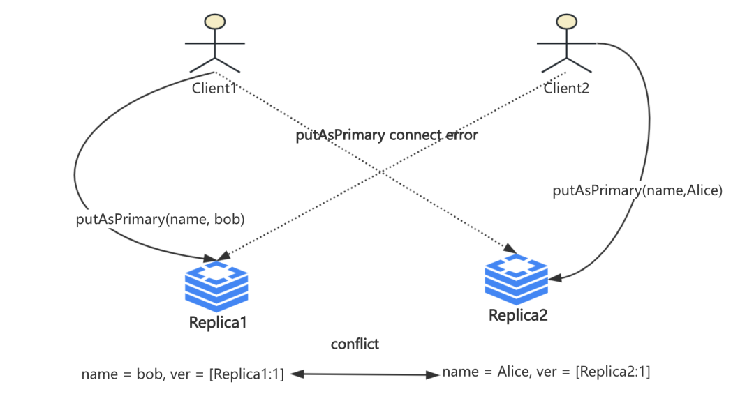 可以看到Client1在进行写入的时候, name对于的Replica2是作为Primary, 但是由于发生网络分区导致使用Replica1执行putAsPrimary, 同样的Client2将putAsPrimary写入到Replica2节点, 这个时候我们会发现版本向量不具备可比性, 由此得出两个版本存在并发冲突.