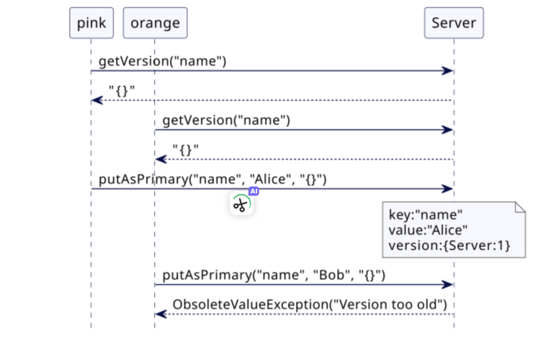 存在两个Client 同时向同一个Cluster发送写请求导致的冲突, 比如下面两个用户分别都获取基于Server维度的向量版本[{}],并同时携带请求写入到同一个Cluster中, 那么哪个请求先到则先应用, 后到的请求由于版本比较旧直接丢弃, 如下: