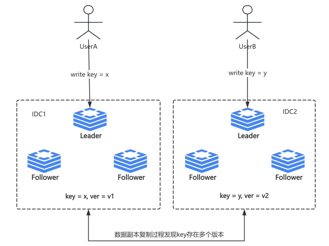 首先我们先看下面一个基于双主复制模型的双数据运营中心部署架构, UserA 以及UserB修改同一份数据分别发起write key = x 以及 write key = y 分别落到对应的IDC1以及IDC2中心, 每个IDC都能够接收key的写入请求并为对应的key赋予对应的版本号, 如下: