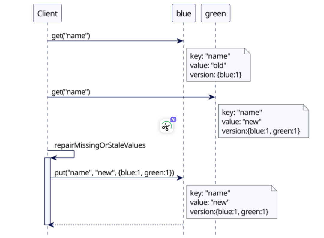 比如在下面的Blue以及Green两个节点均存储了name的两个版本值,其中green节点存储name最新值以及对应的版本号name = new & [blue:1, green: 1]. 当客户端分别从两个节点, 即blue 以及 green 节点中读取数据值, 发现green读取到name的数据值对应的版本号更新, 于是这个时候客户端发起PUT请求修复blue中存储name的旧数据, 如下: