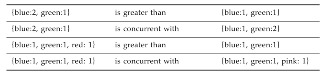 比如现在有四个可接收请求写入的节点blue、green、red以及pink, 那么这个时候版本向量的比较方式示例如下: