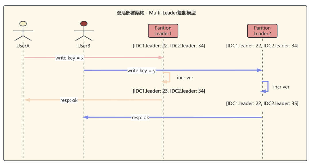 对于Multi-Leader复制模型, 以双活部署架构为例, 在上述的User A以及UserB分别发起请求写操作落到对应的node节点上,对应的node节点会针对当前的key所对应的版本号递增,其请求流程如下: