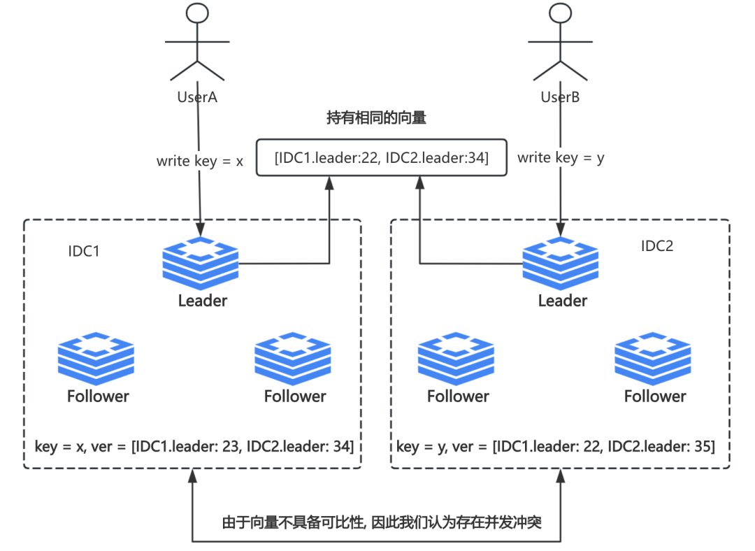 通过上述的版本向量我们可以识别到IDC1.leader持有key对应的向量[IDC1.leader: 23, IDC2.leader: 34] 与 IDC2.leader持有key 对应的向量[IDC1.leader: 22, IDC2.leader: 35] 存在冲突, 因为两个向量不具备可比性, 是属于并发关系.