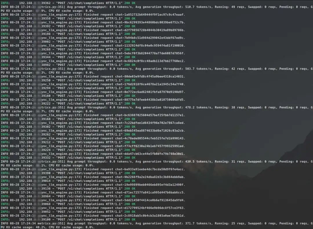 利用 14x GPU AI 服务器中的 8 块 GPU,仅通过 GPU 卸载,服务器在处理 Llama 3.1 70B BF16 时,通过 vLLM 使用张量并行的批量推理,可达到每秒约 800 个 token,同时处理 50 个异步请求。
