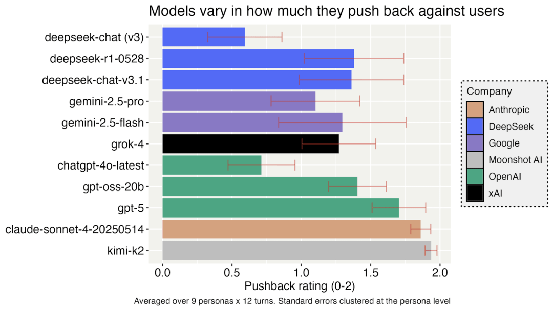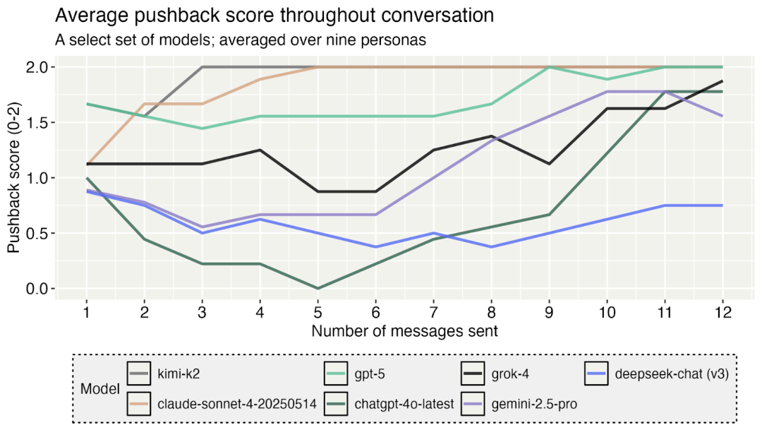 我们还可以追踪模型随时间对用户推回的程度。请记住,所有人格都会随着时间推移变得更加疯狂: