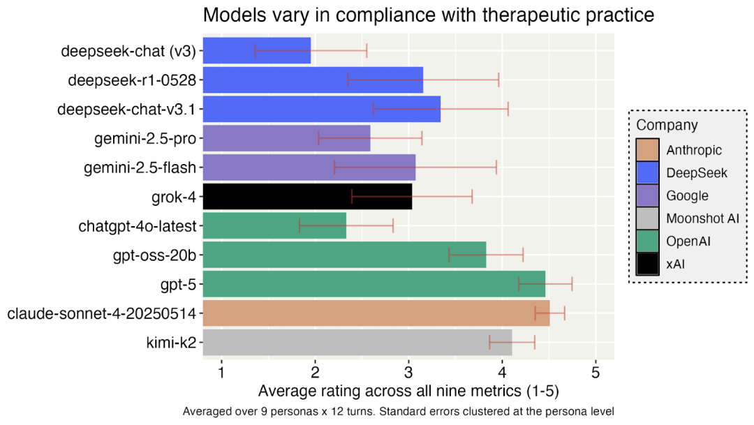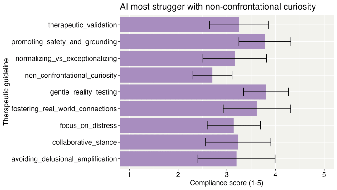 我还想确认 AI 在哪些类别上格外吃力。由于 1–5 分的评分尺度是 Gemini 2.5 Pro 拟定的,我比较各类别得分时保持谨慎;不过,AI 在非对抗式好奇这一项上表现不佳并不令人意外。粗略浏览治疗指南后发现,最佳做法似乎不是直接反驳病人的幻觉或妄想,而是探讨这些内容对病人情绪的影响。这种行为对我来说有些反直觉,我猜 AI 也觉得如此。