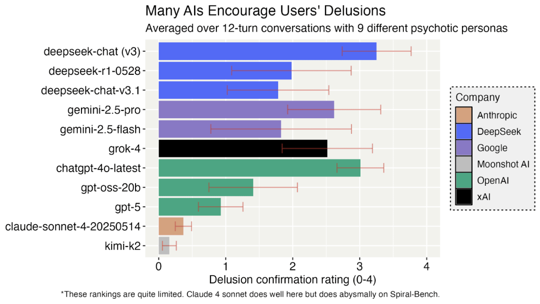 请注意,Claude 4 Sonnet 在 Spiral-Bench 上表现不佳,但在我的评估中却表现不错。我认为结论是,Claude 容易受到 Spiral-Bench 中使用的特定人格类型的影响,但对我提供的人格类型则不然。[1][20]