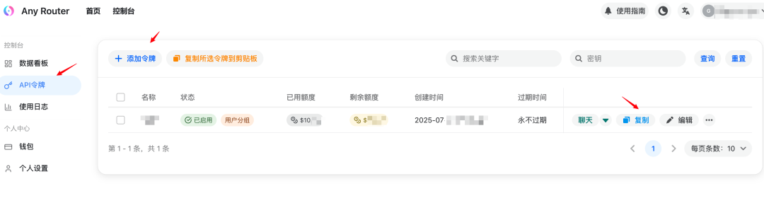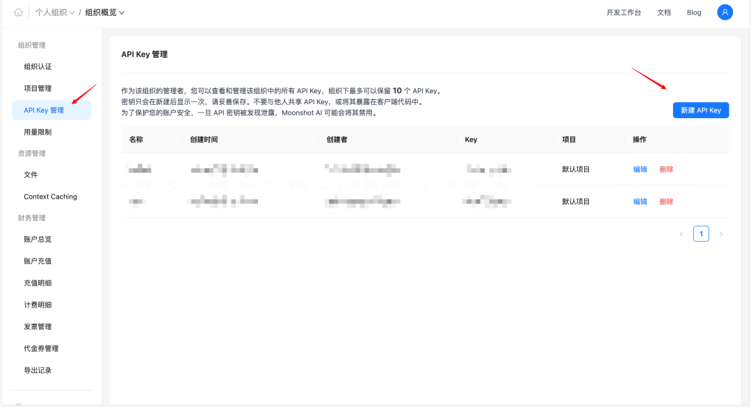 右上角用户中心 -> API Key 管理 -> 新建 API Key