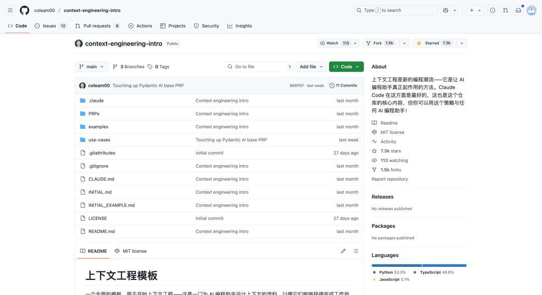 在使用 Claude Code 完成编程任务的时候,推荐使用「context-engineering-intro」这个上下文工程模板启动项目。