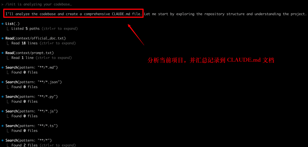 运行 /init 命令会自动创建一个 CLAUDE.md 文件,里面包含了给 Claude 的详细指令和项目说明