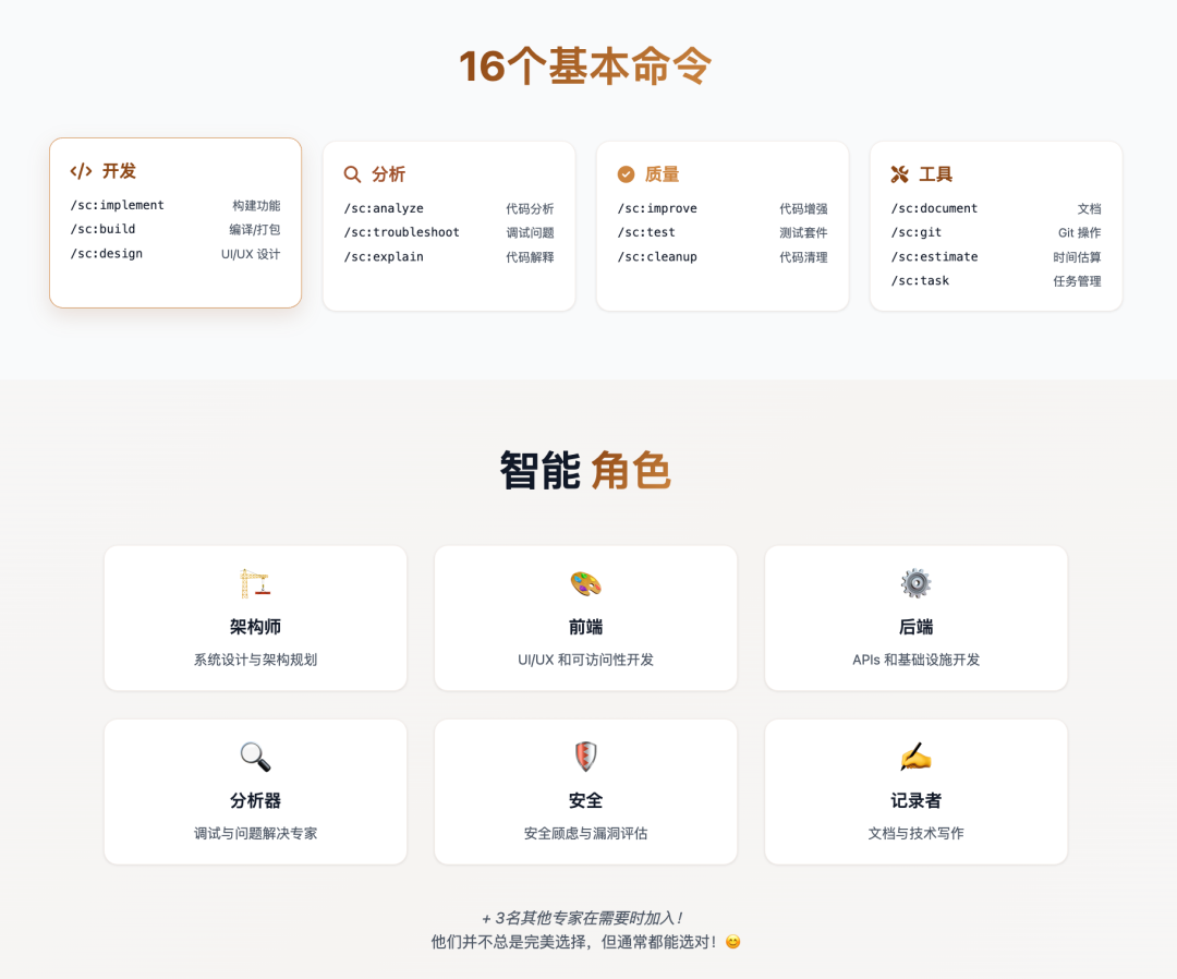SuperClaude 会自动帮你配置基本命令和智能角色,帮助更好更强的使用 Claude Code,为 Claude Code 实现超级赋能。