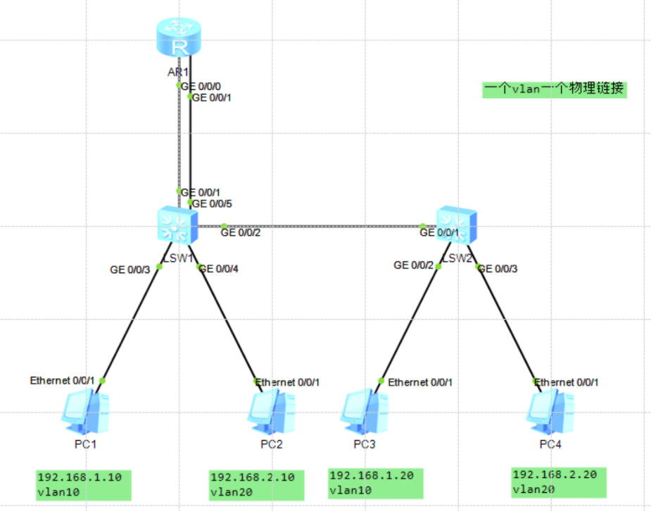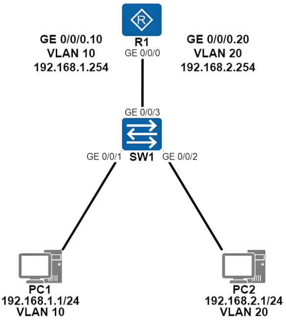 技术实现:在路由器的一个物理接口上创建多个逻辑子接口,通过一条Trunk链路连接交换机。