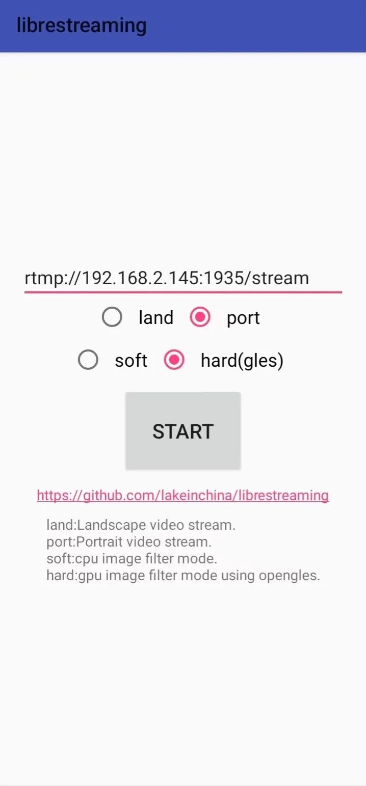 确保手机和电脑连接了同一个WiFi,再往librestreaming的App配置界面填上MediaMTX的完整推流地址如“rtmp://192.168.*.*:1935/stream”,接着点击START按钮,打开推流预览界面如下图所示。