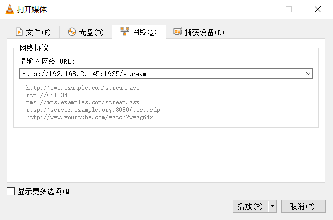 然后电脑打开VLC media player,依次选择菜单:媒体→打开网络串流,在弹窗的URL栏输入对应的MediaMTX拉流地址“rtmp://192.168.*.*:1935/stream”如下图所示。