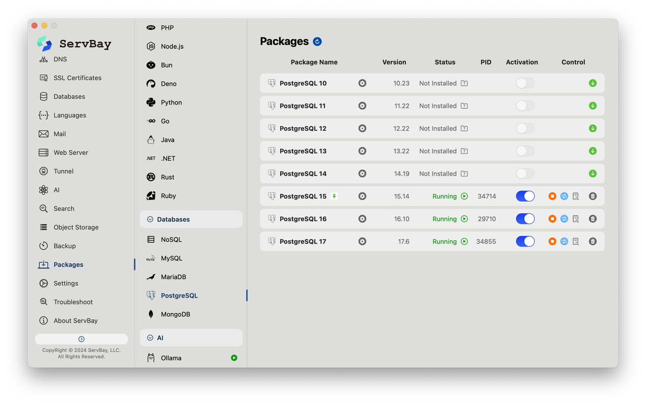 在深入这些技巧之前,一个顺手的本地开发环境是必不可少的。推荐使用 ServBay,它不仅可以一键安装和管理PostgreSQL,还支持多个不同版本的数据库实例同时运行。