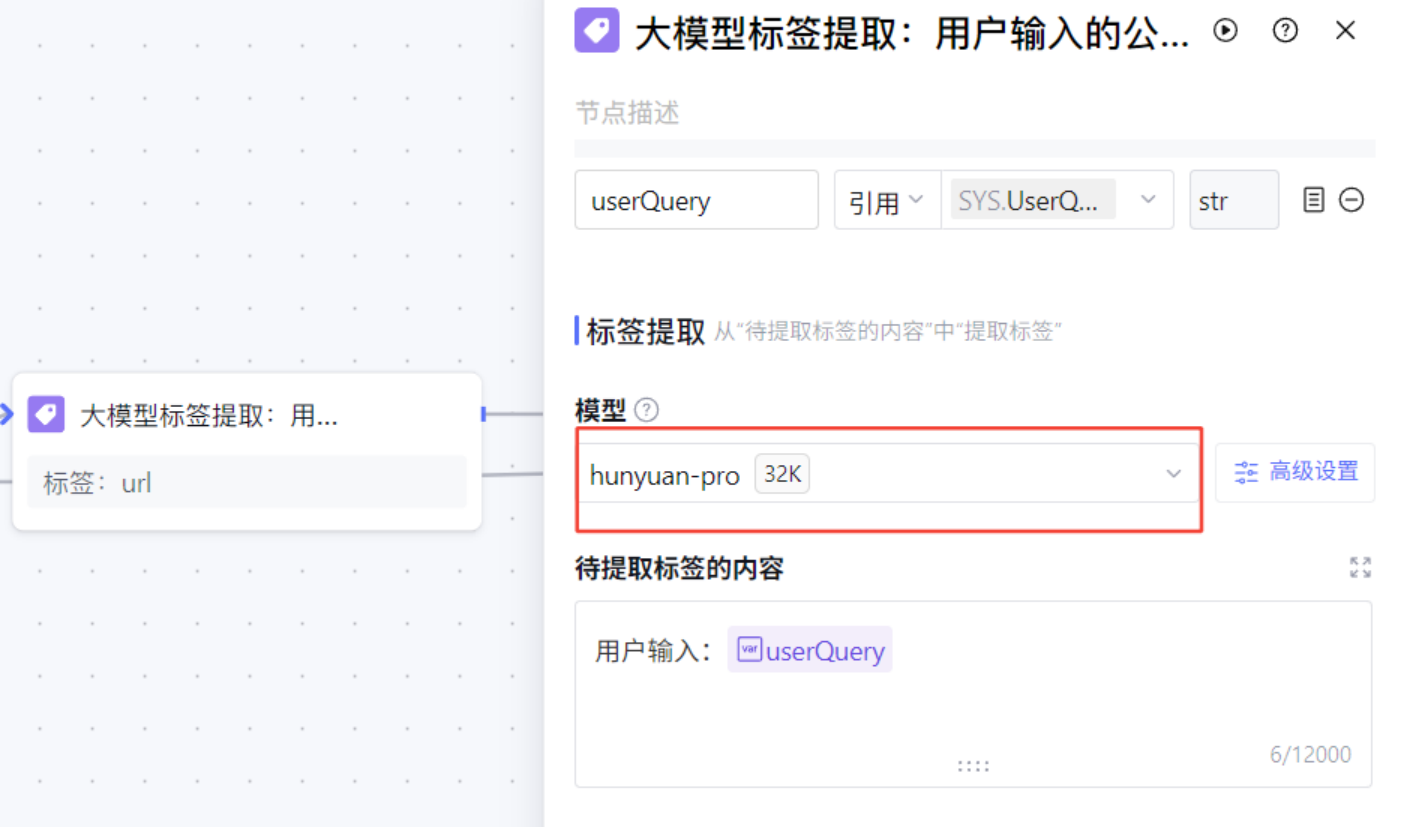 如果放在以前,我们想要在一段文本中提取一个url,首先会用的是正则表达式,但是在这里我们使用大模型提取标签节点,模型选择hunyuan-pro,将用户的输入当做待提取标签的内容,然后在使用提示词告诉大模型要提取的标签内容即可。