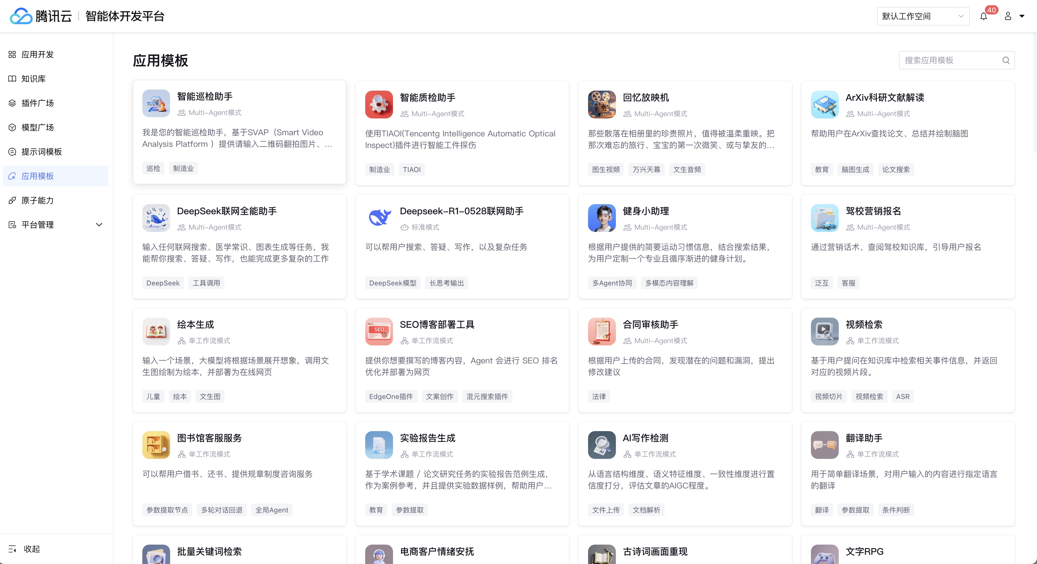 进入到腾讯智能体开发平台,我们可以看到有很多的应用模板,如果我们对构建智能体不太熟悉的话,可以复制这些智能体应用进行学习。