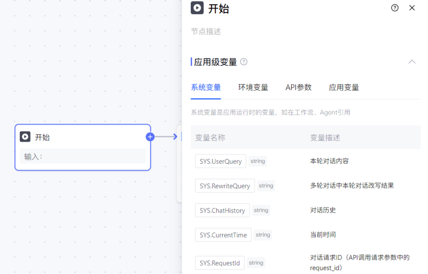 我们看开始节点,可以看到系统变量中可以获取当本轮的对话内容,这个就是用户的输入。