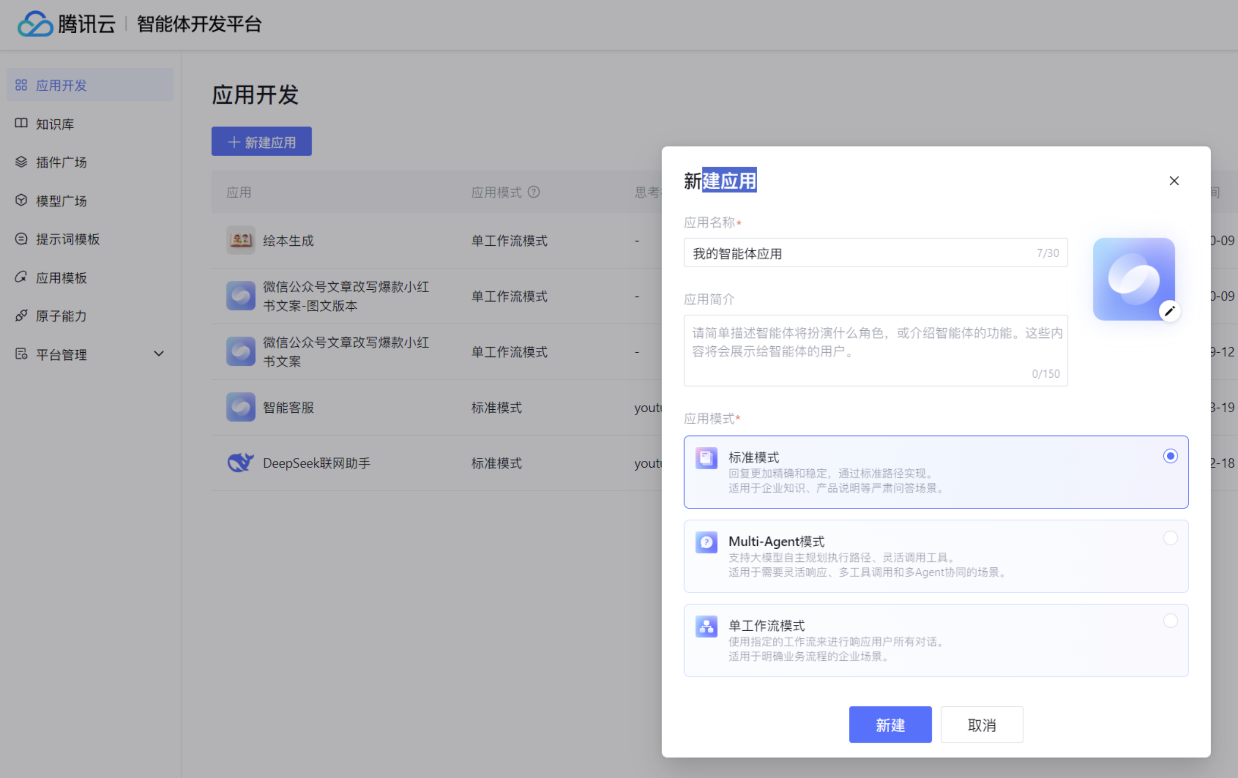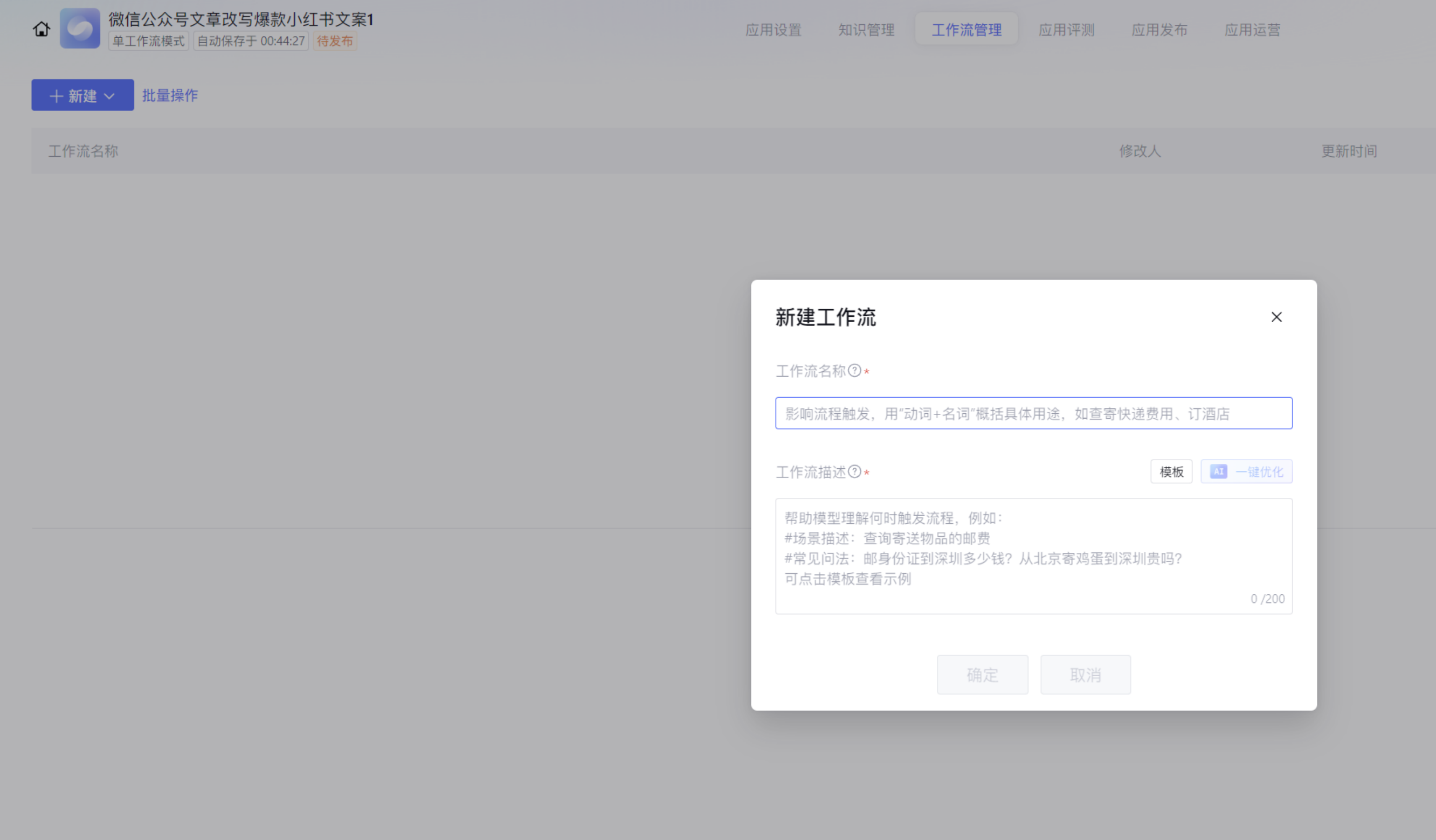 我们在应用开发菜单中点击新建应用,输入应用名称就可以新建一个智能体应用,在这里我们可以选择应用模式,因为我的功能单一不需要进行对话,所以这里我们可以选择 单工作流模式,功能完全依赖于工作流。