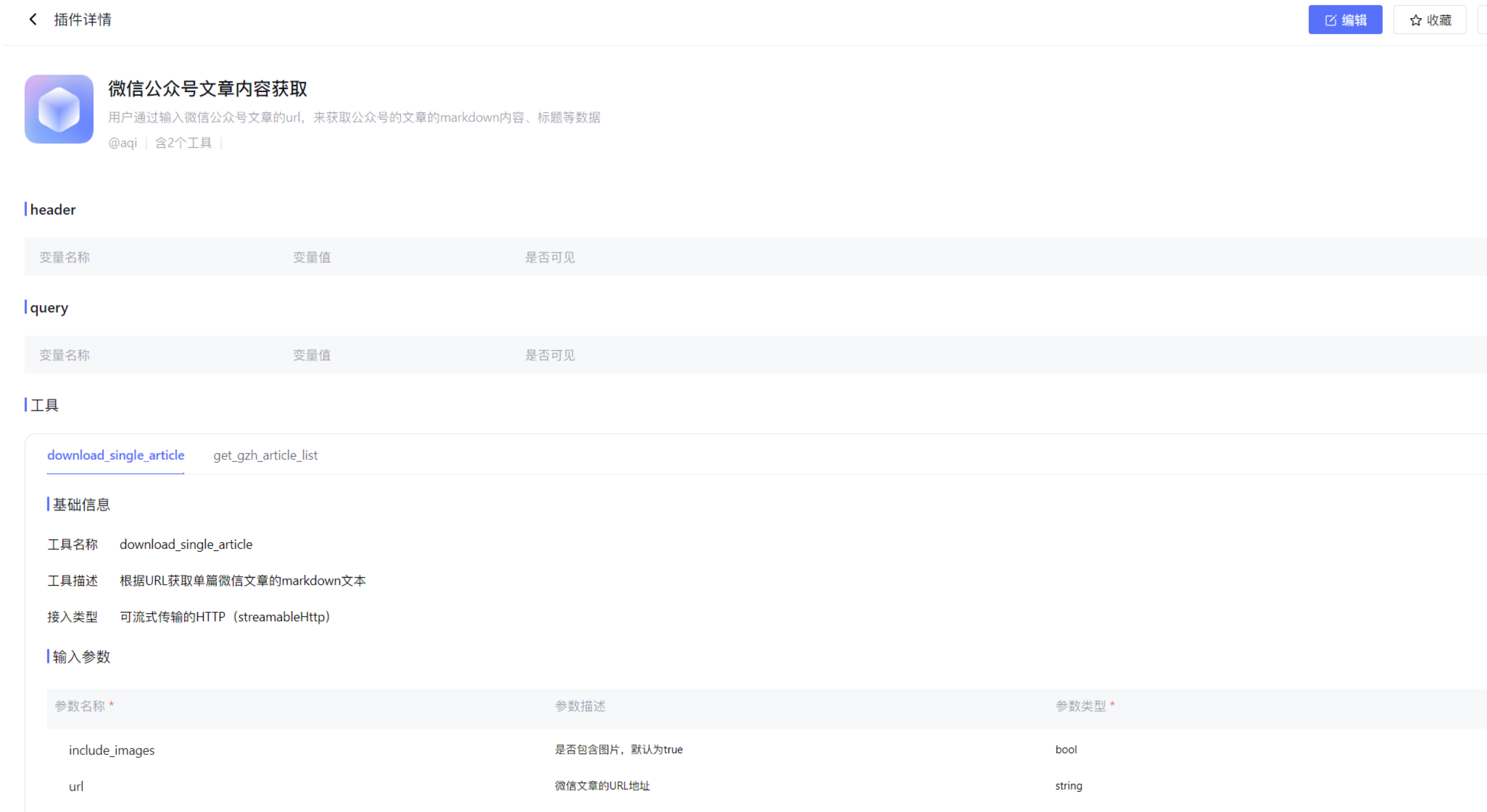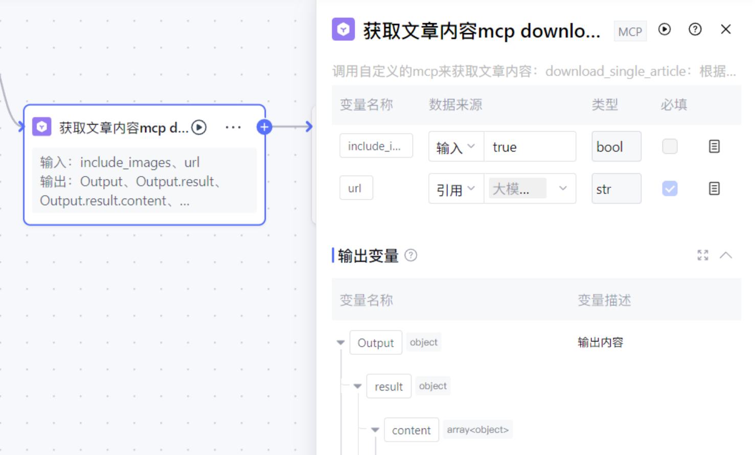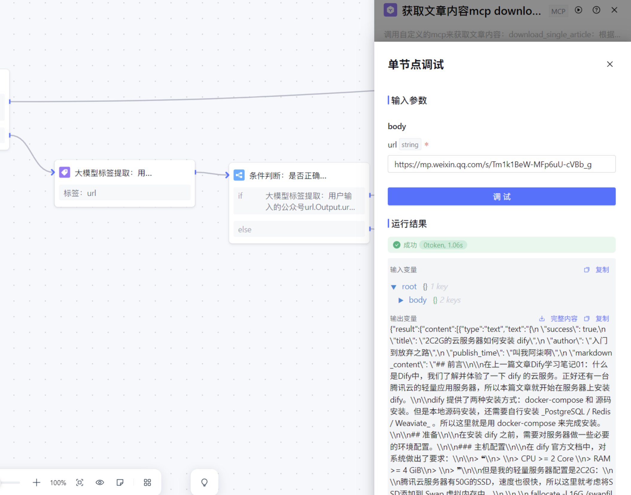 可以看到在工具栏有一个download_single_aritcle 的工具,通过输入公众号文章url就可以获取markdown信息。然后我们配置好这个节点。