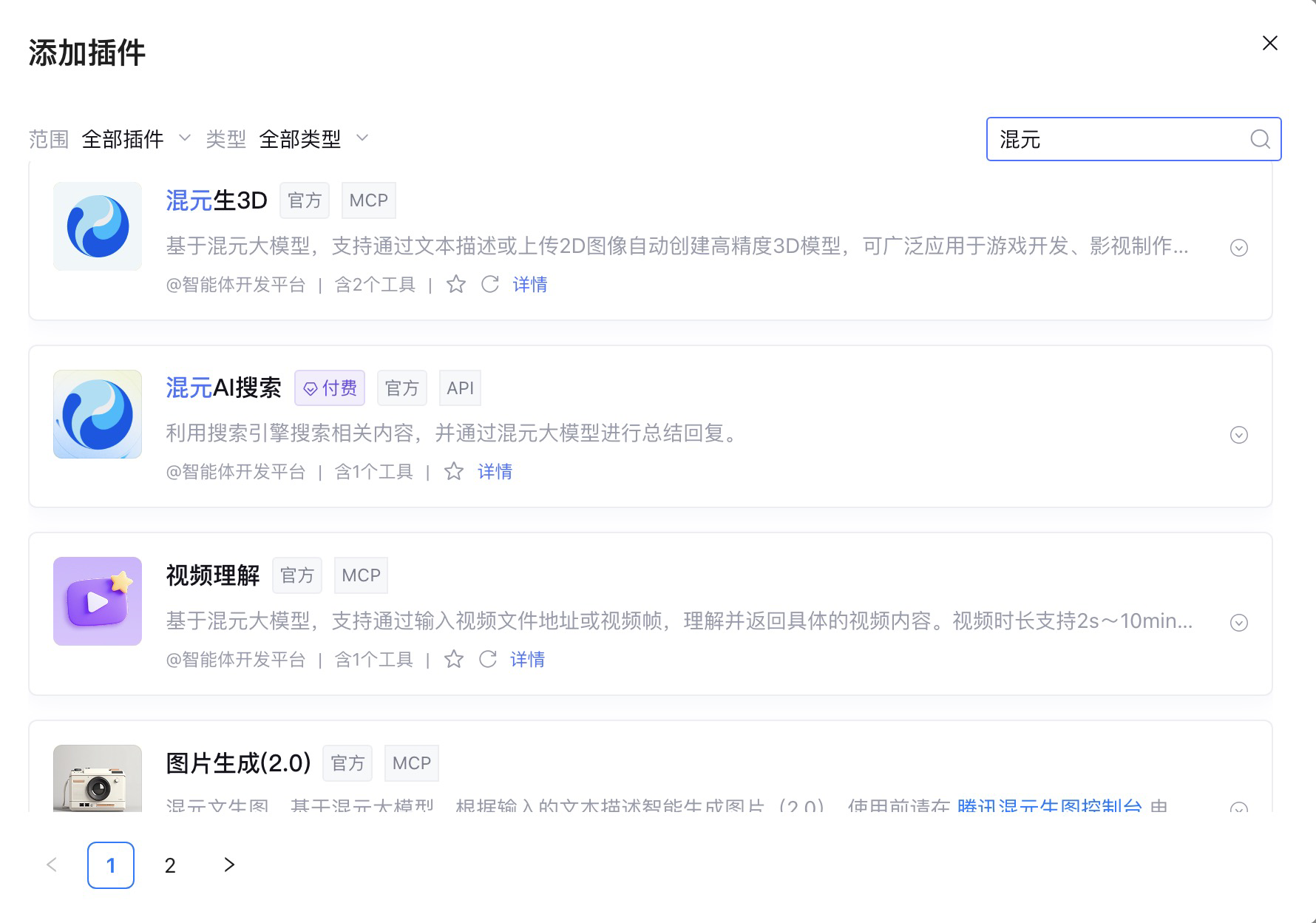 然后我们可以根据大模型生成的文本内容,调用混元生图2.0来生成小红书封面。那么该如何使用混元生图2.0呢?和之前调用mcp插件一样的方式,添加一个插件节点,搜索 混元 关键词,就可以智能体开发平台发布的关于腾讯混元AIGC产品的插件。