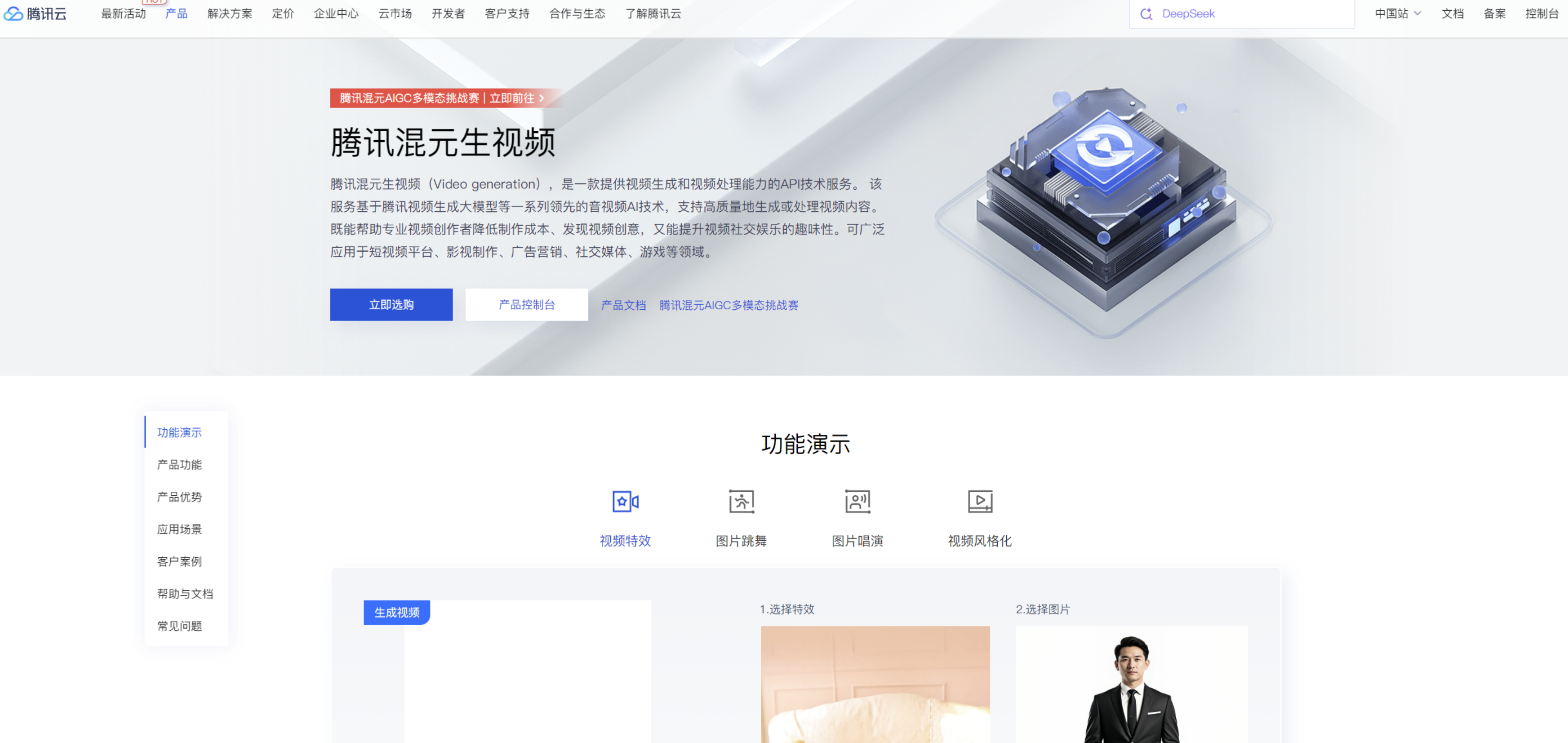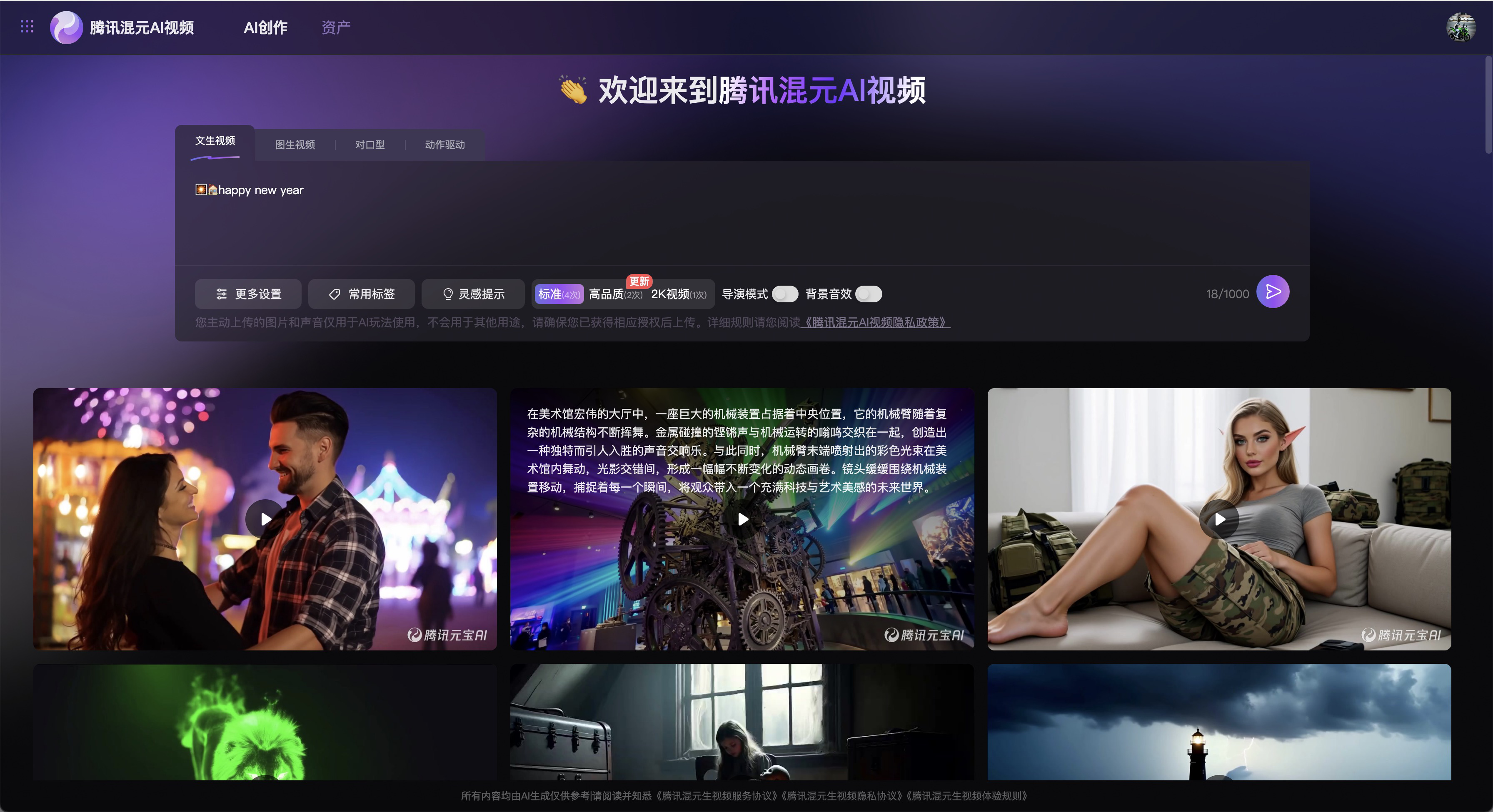 我们也可以通过进入腾讯混元AI视频,通过提示词或者上传图片等方式,来体验混元AI生成视频的能力。
