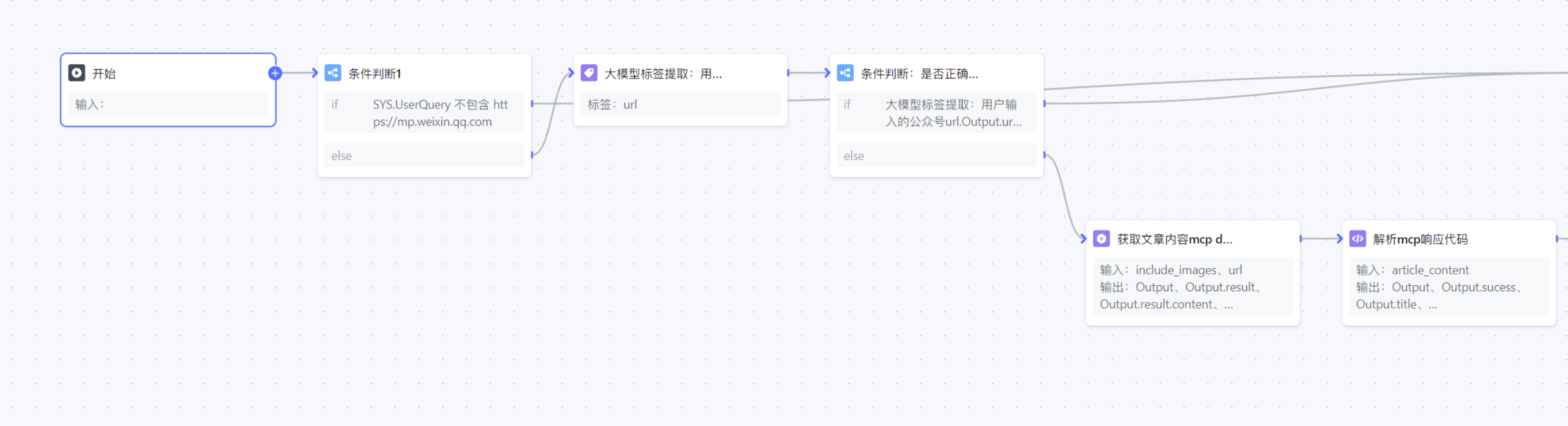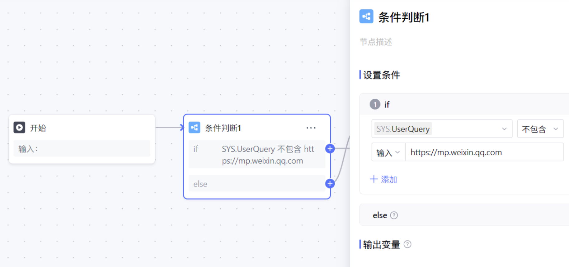 在下一个条件判断节点,判断用户的输入中是否包含公众号文章的url域名,如果包含的话才能进行下一个节点。