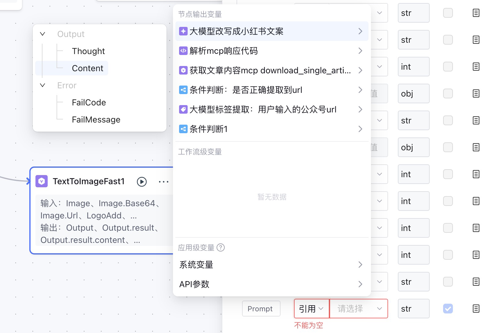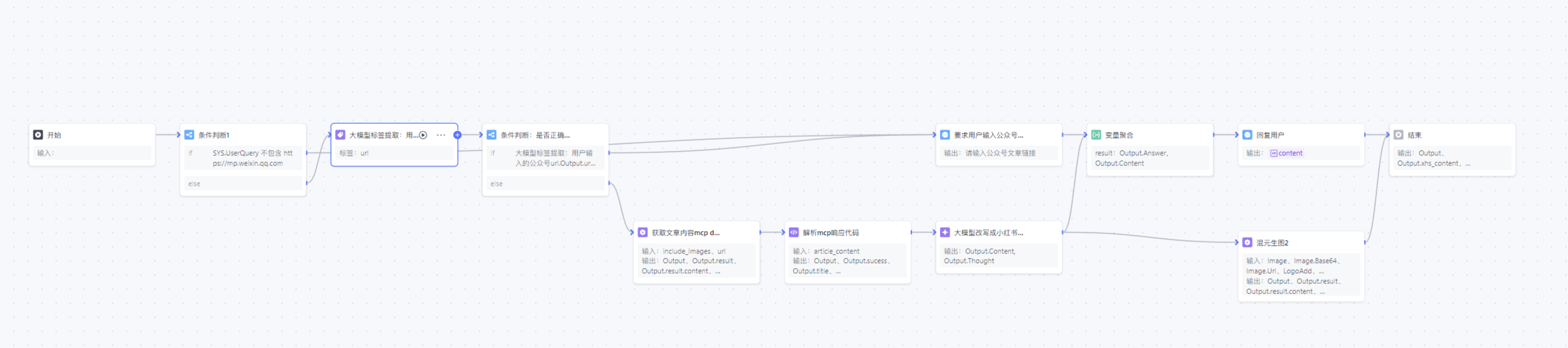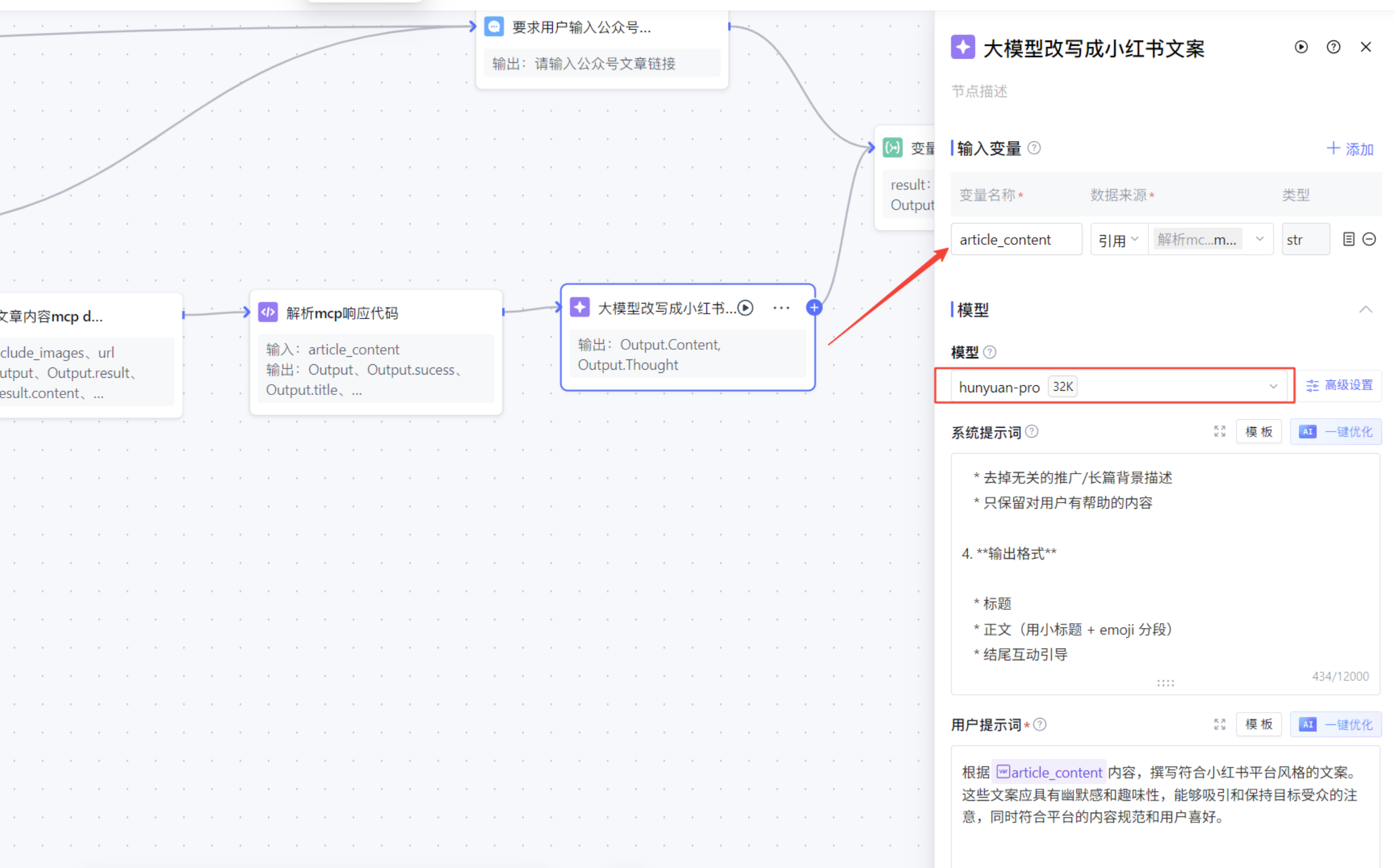 首先是使用大模型节点,根据mcp插件提取的公众号文章内容也就是输入变量article_content ,来生成符合小红书风格要求的文案。