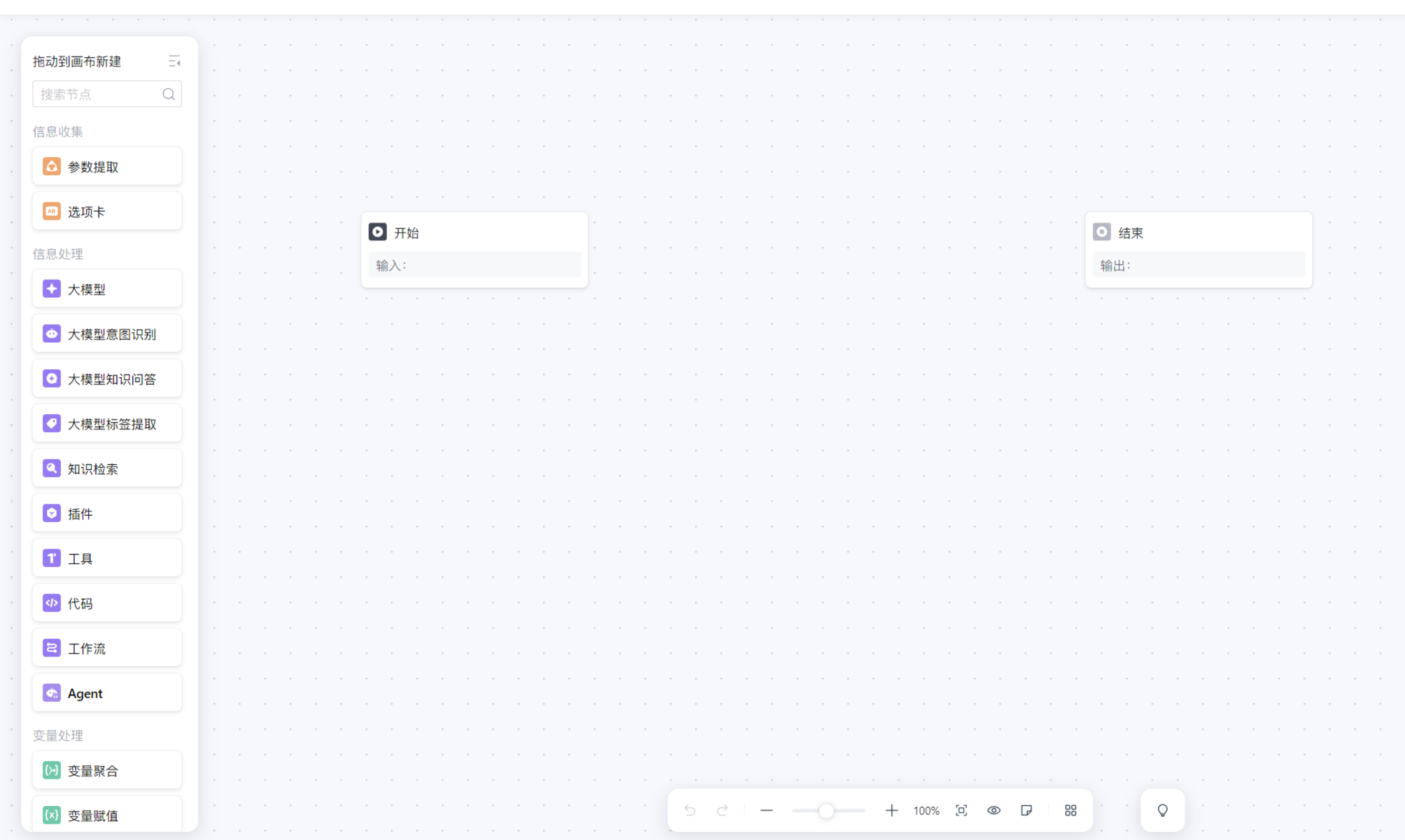 如上图所示,一个工作流必须有两个节点:开始和结束。开始用来接收用户的输入,结束用来将最终工作流的结果返回给用户。中间的节点则是我们调用不同的组件、大模型、工作流以及代码等工具,来完成一系列复杂的处理流程。