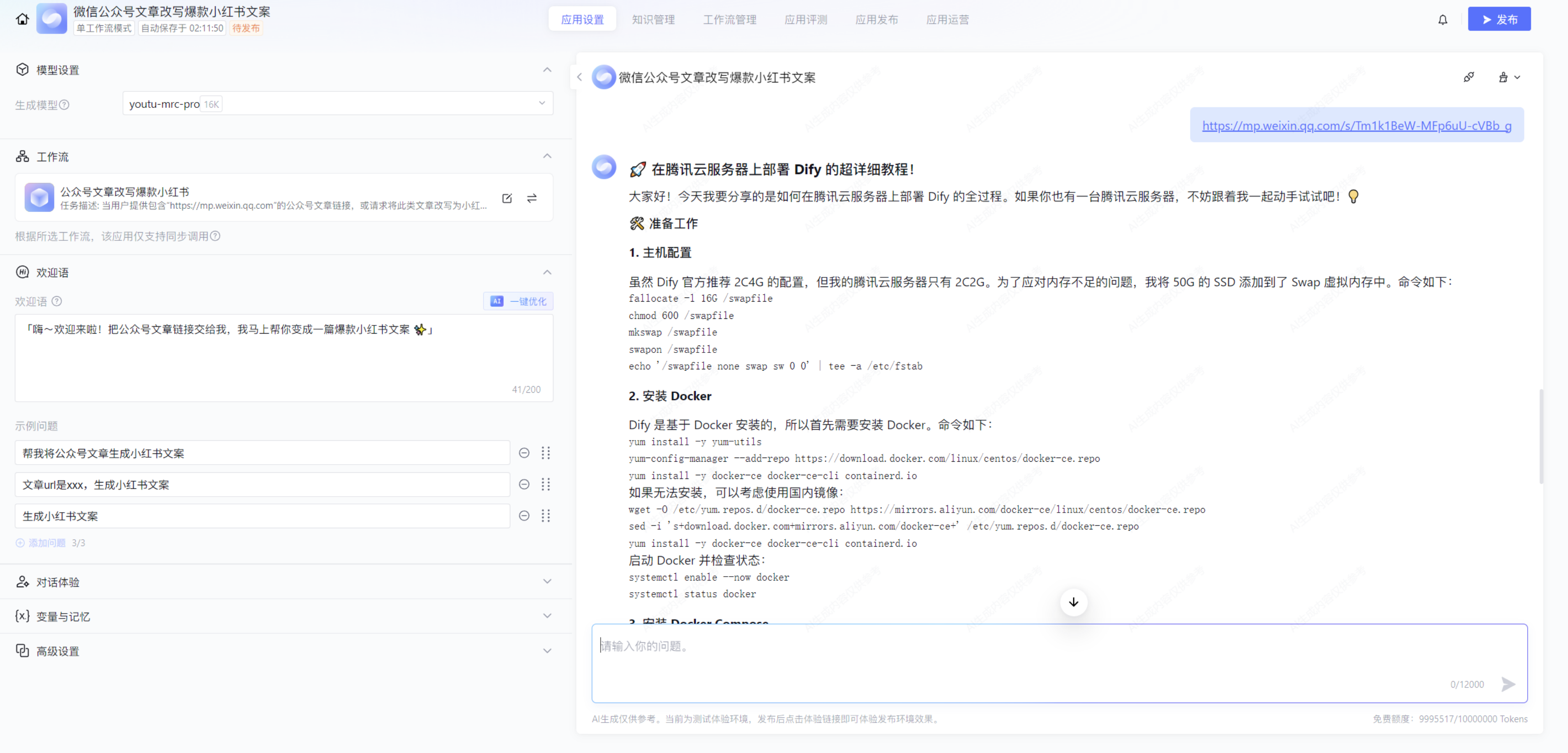 微信公众号文章改写爆款小红书文案,是基于腾讯云智能体开发平台实现的智能体,主要功能是将用户输入的公众号文章url,通过调用工作流来公众号文章内容的读取,并通过混元大模型生成爆款小红书文案,结合混元生图实现了公众号文章内容到小红书的自动化改写。