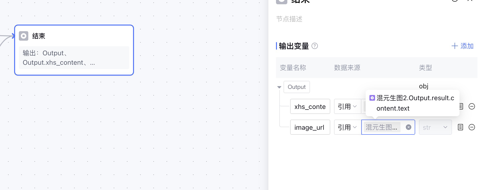 最后在结束节点输入混元大模型改写的小红书文案和混元生图生成的封面。