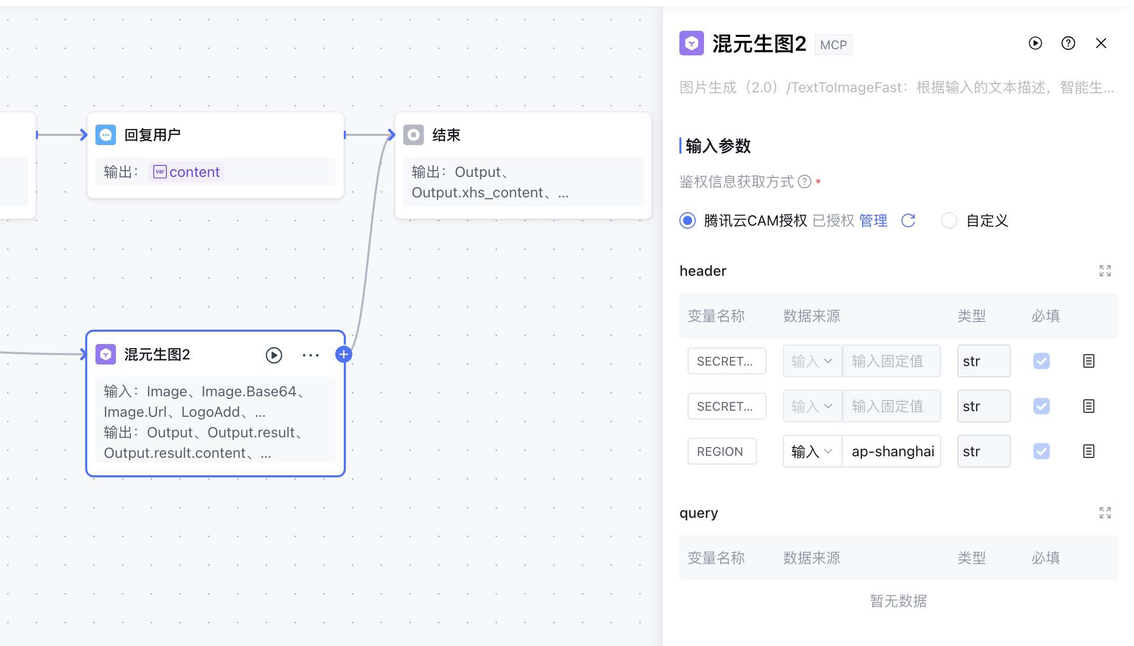 在这里选择下面的 图片生成(2.0) 这个插件即可。然后按照要求进行CAM授权,并设置REGION。