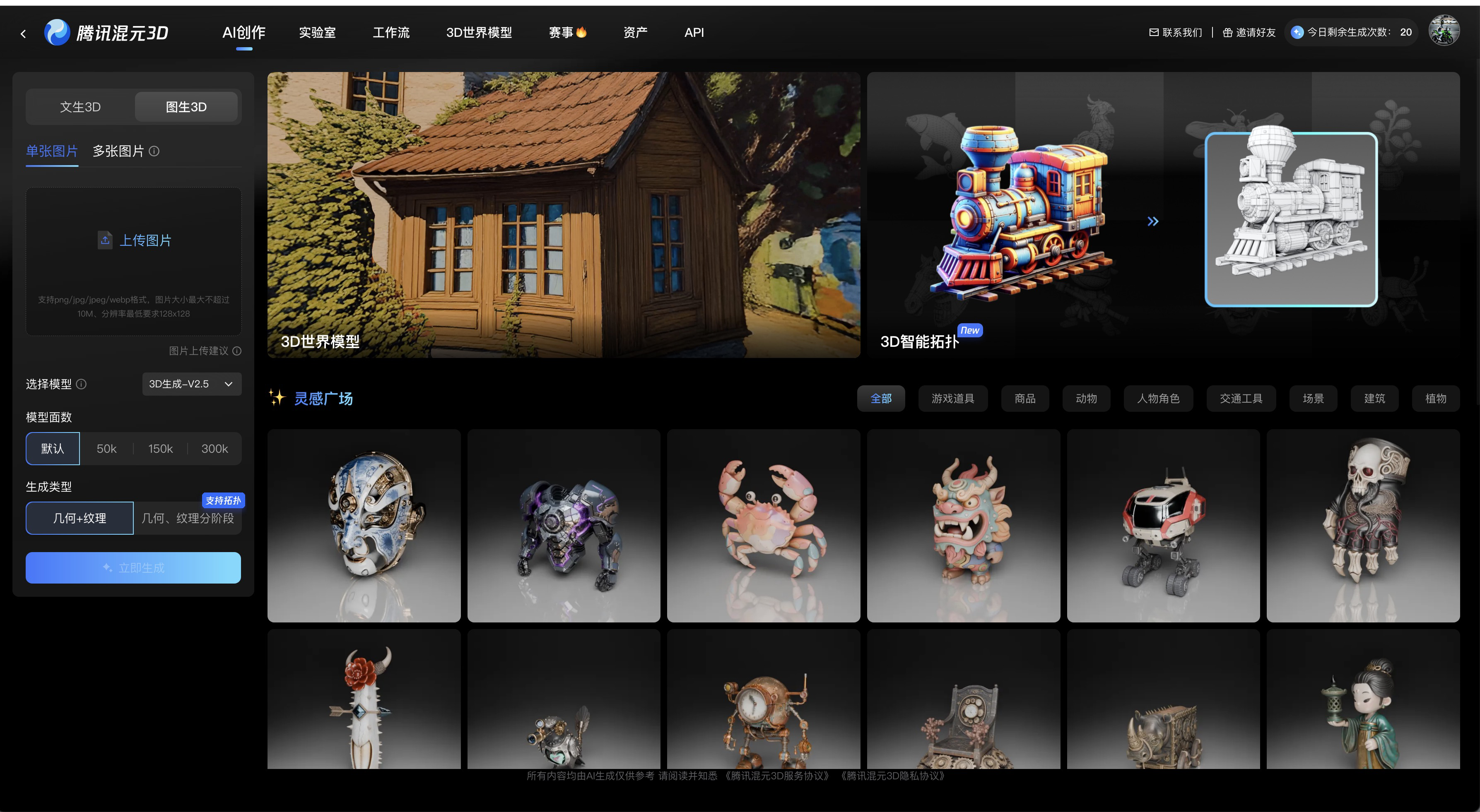 除了通过API调用腾讯混元生3D的能力,我们也可以直接进入腾讯混元3D的开发页面,通过可视化上传2D图像来生成3D模型,还可以调整3D模型的参数。