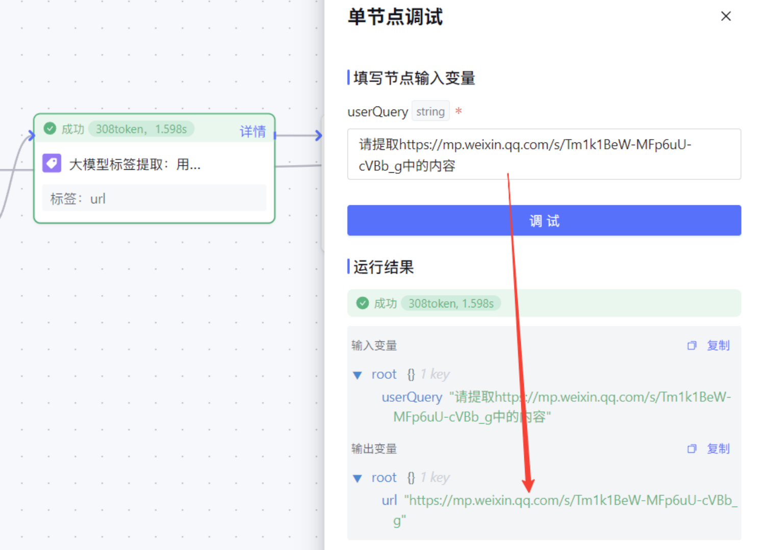 为了验证提取的准确性,我们可以进行单节点调试,输入包含公众号文章URL的文本,然后可以看到已经完成了提取。
