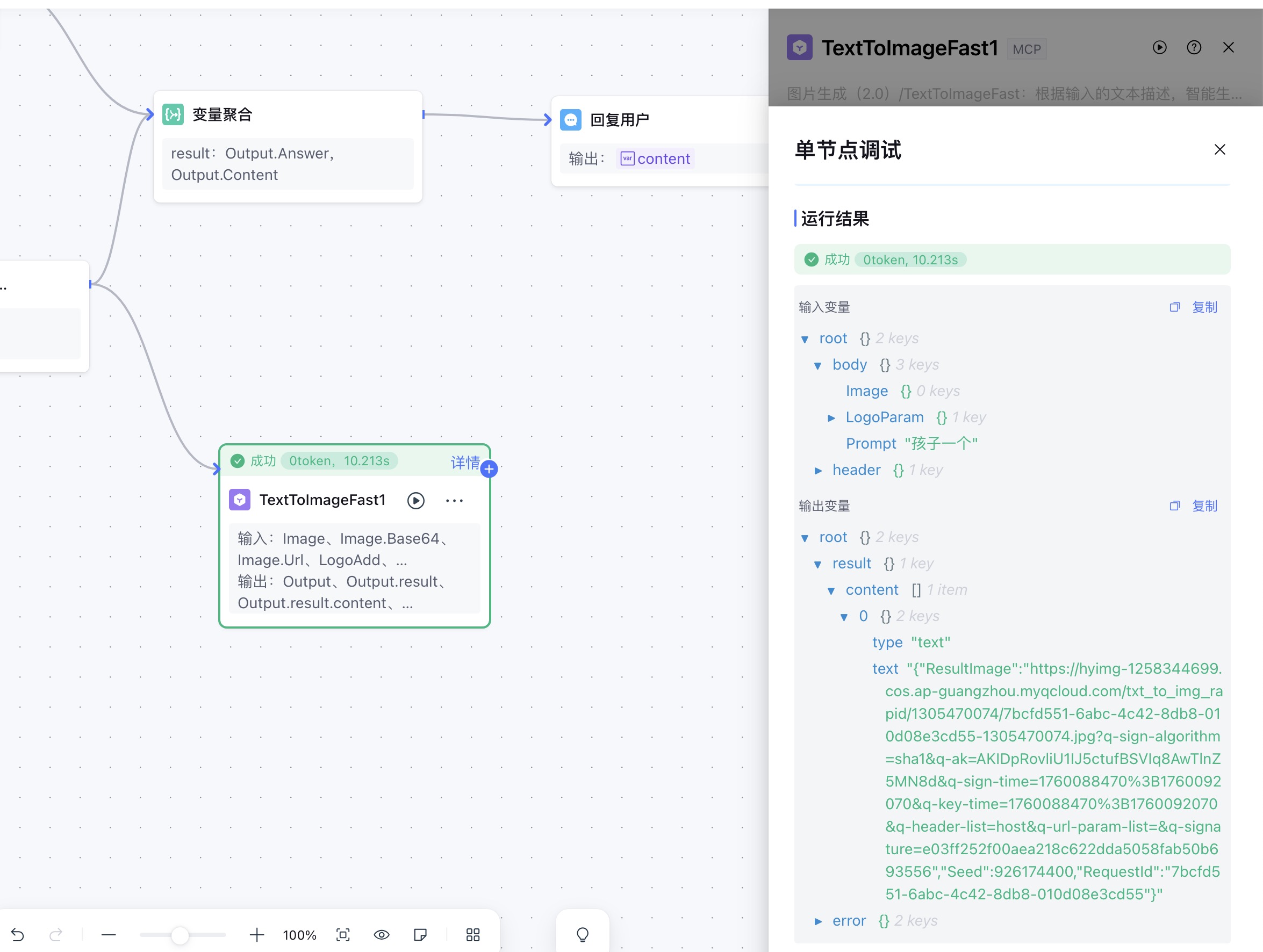 点击单节点调试,就可以看到成功调用混元生图生成了一张图片。