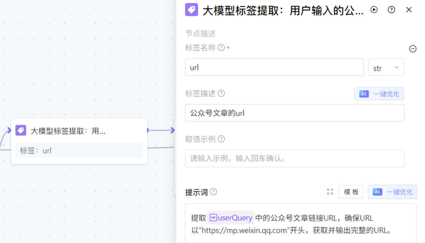 下一个节点就是大模型提取标签,目的就是提取用户输入文本中的公众号文章url。