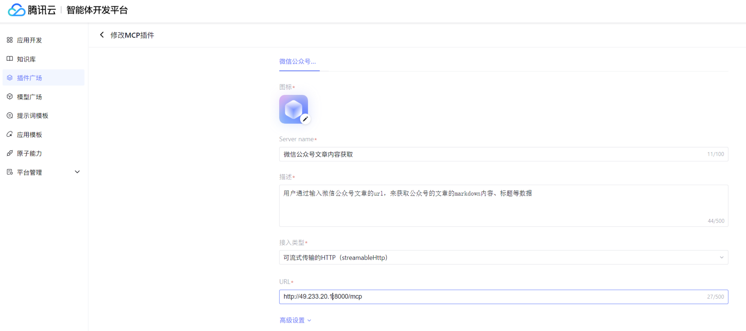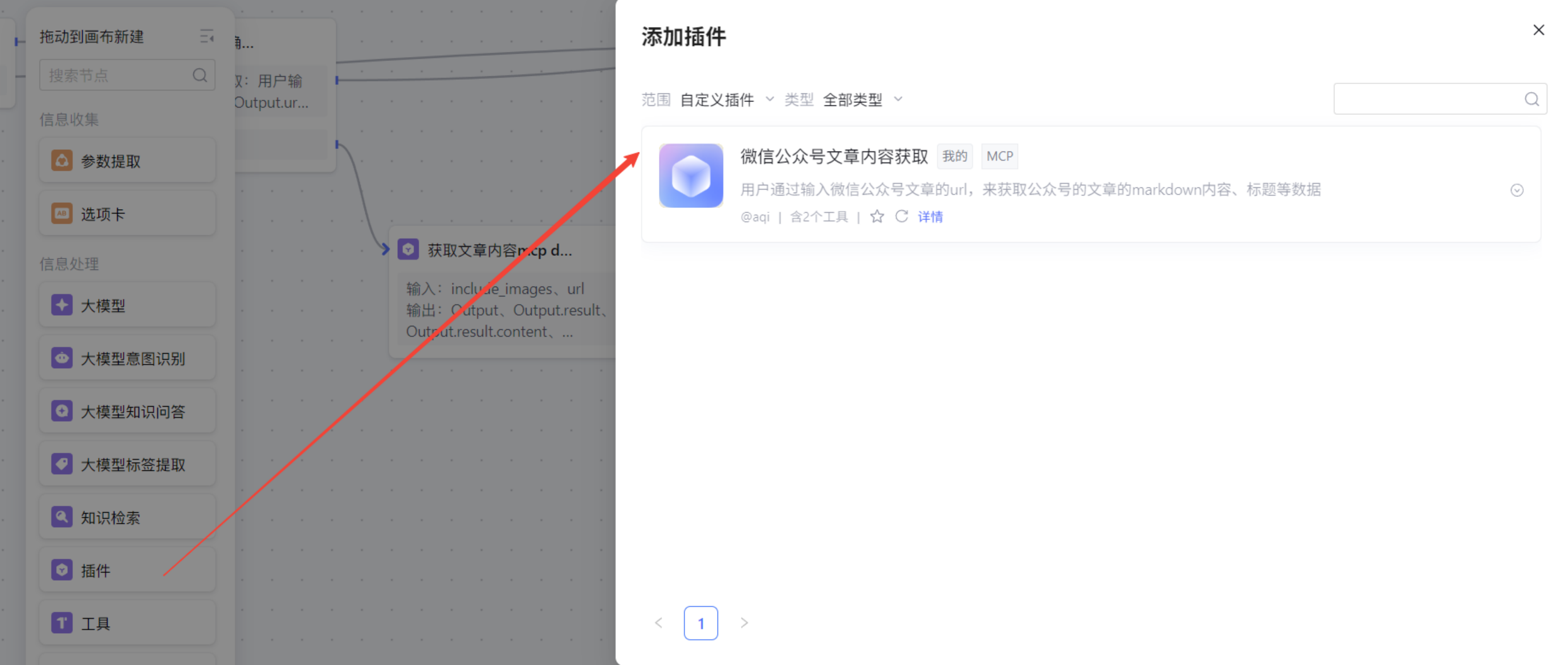 然后就是根据url获取文章内容,这里我使用的是 插件 节点,然后调用的是我自定义的mcp插件,输入公众号文章的URL即可返回文章内容。添加一个插件节点,就可以选择使用自定义插件或者其他人发布的插件。