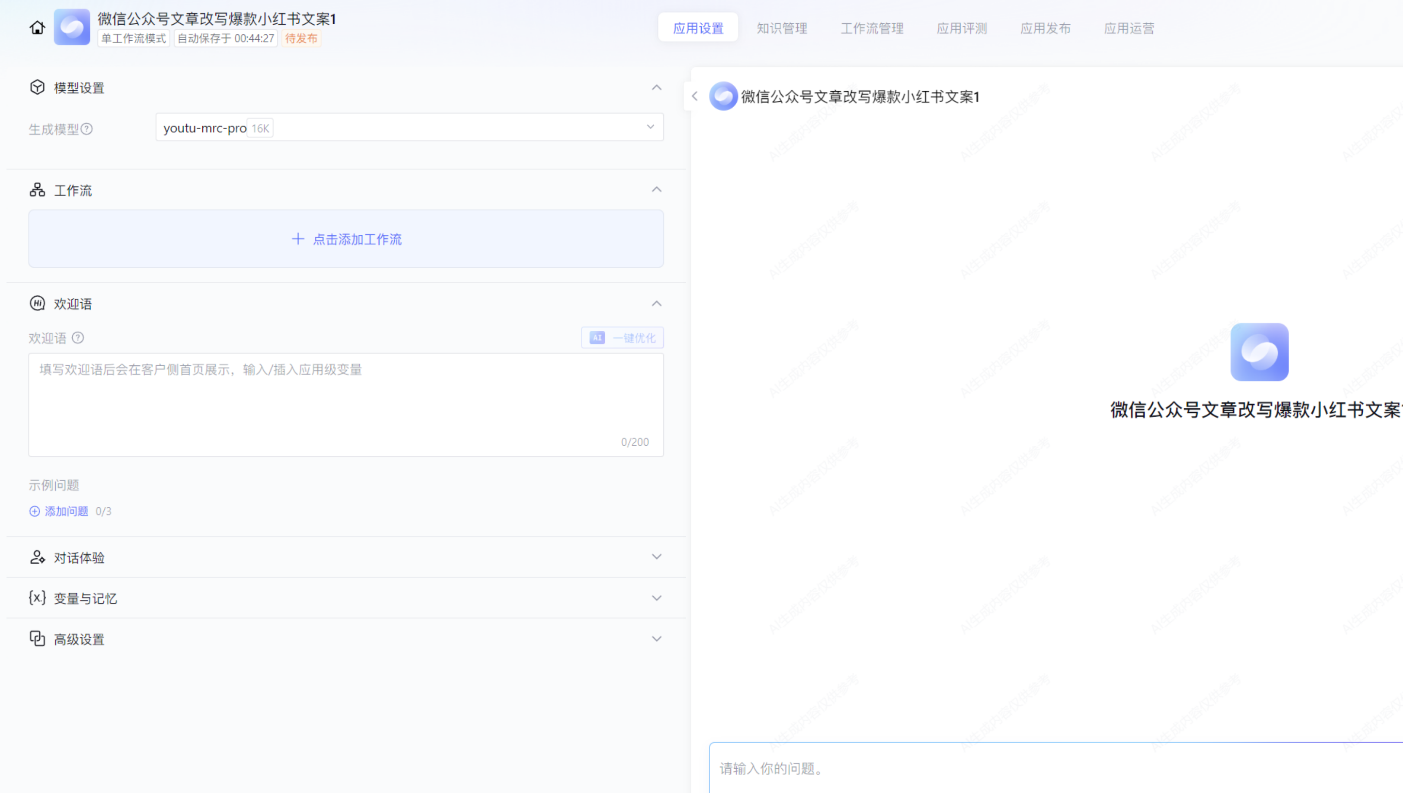 在页面中,我们可以看到可以添加工作流、设置欢迎语和初始问题。这里我们首先关注工作流的创建,点击添加工作流,或者点击上方的 工作流管理, 点击新建就可以创建一个工作流。