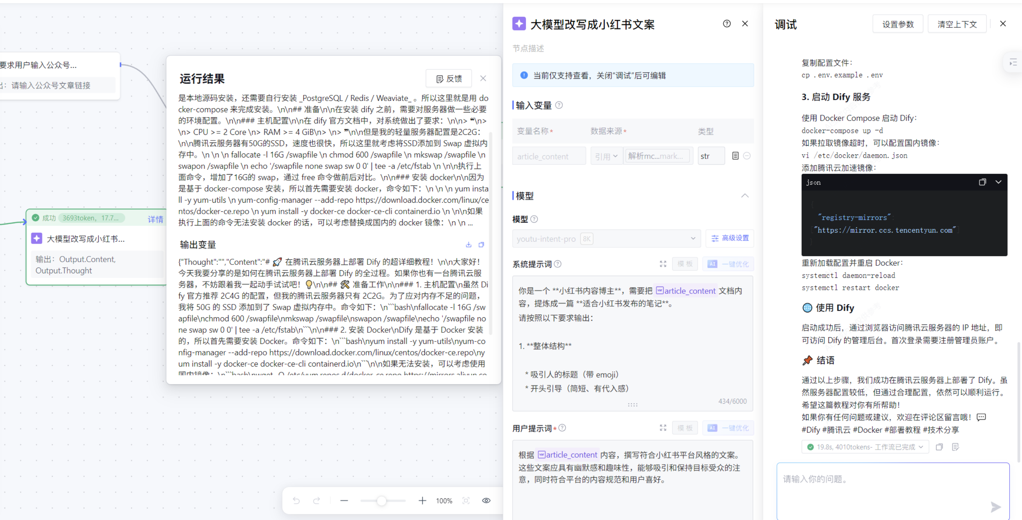 在启动调试之后,可以看到,混元大模型改写的小红书文案还是非常符合要求的。