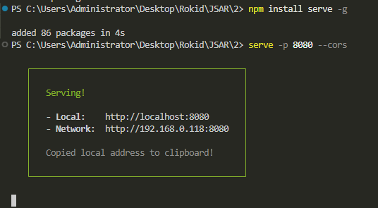 浏览器预览:JSAR 也支持在 Web 浏览器中模拟 AR 效果。首先,我们需要一个本地 Web 服务器: