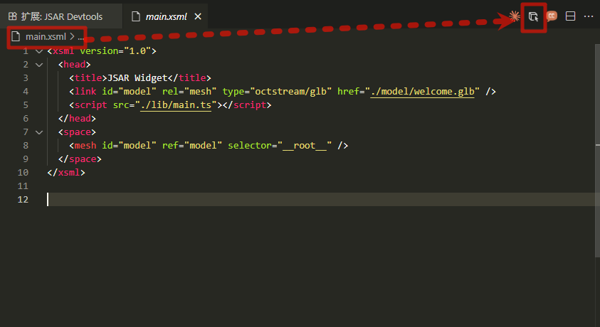 main.xsml:JSAR 项目的“空间入口”,类似 Web 开发中的 index.html。它采用 XML 格式来描述 3D 场景的结构,比如模型、光源、脚本等。