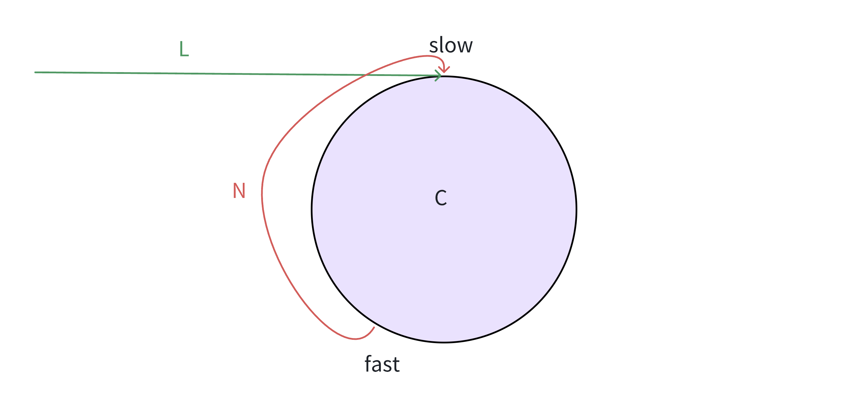 slow⼀次走⼀步,fast⼀次走2步,fast先进环,假设slow也走完⼊环前的距离,准备进环,此时fast 和slow之间的距离为N,接下来的追逐过程中,每追击⼀次,他们之间的距离缩小1步