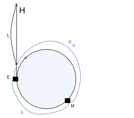 说明: H为链表的起始点,E为环入口点,M与判环时候相遇点 设: 环的⻓度为R,H到E的距离为L,E到M的距离为 X ,则:M到E的距离为 R-X 在判环时,快慢指针相遇时所⾛的路径⻓度: fast: L+X + nR slow:L+X