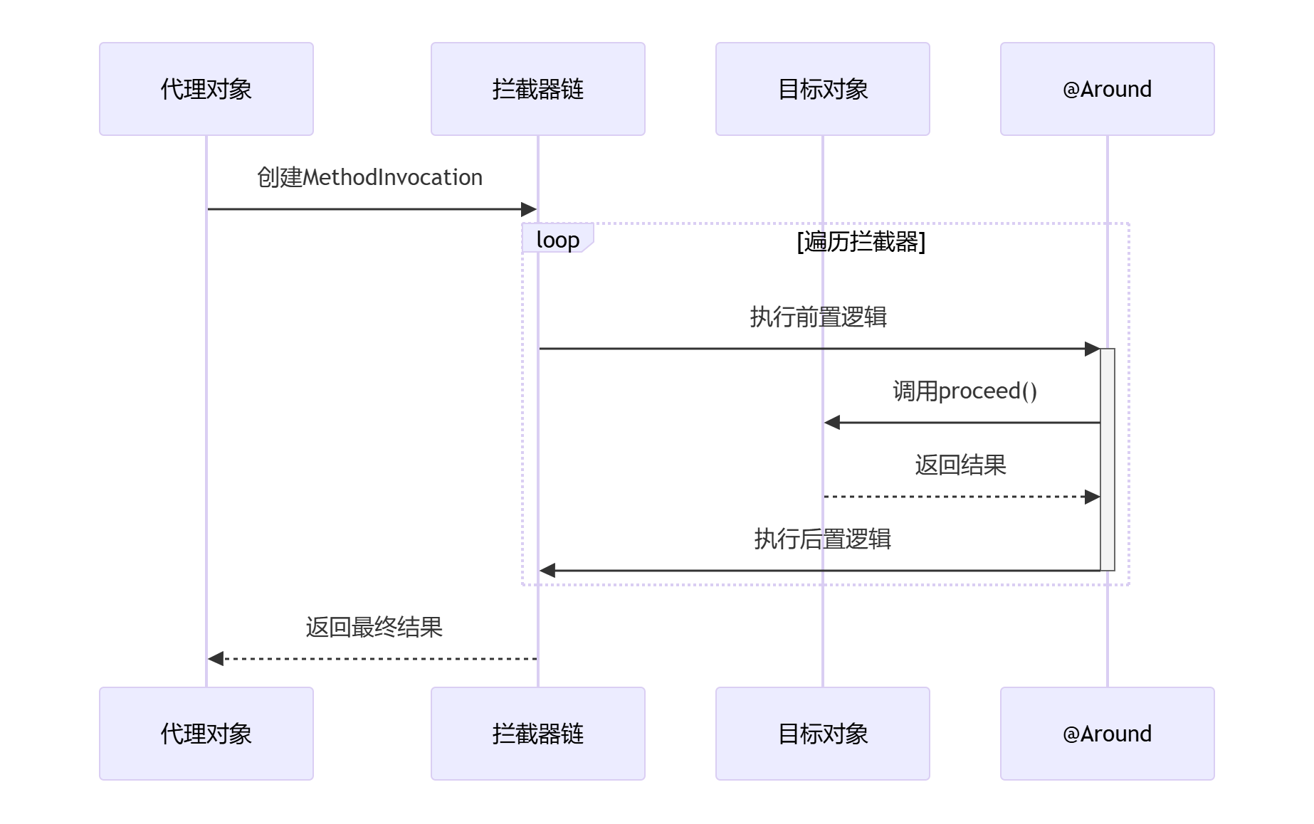 return new ReflectiveMethodInvocation(target, method, args, chain).proceed();