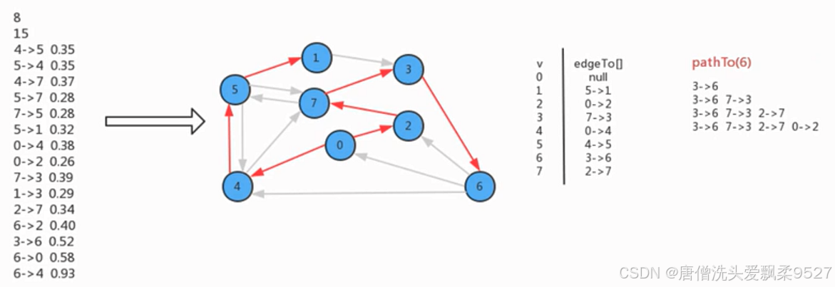 成员方法 | 1. private void relax(EdgeWeightedDigraph G,int v):松弛图G中的顶点2. public double disTo(int v):获取从顶点s到顶点v的最短路径的总权重3. public boolean hasPathTo(int v):判断从顶点s到顶带你v是否可达4. public Queue<DirectedEdge> pathTo(int v):查询从起点s到顶点v的最短路径中所有的边 |