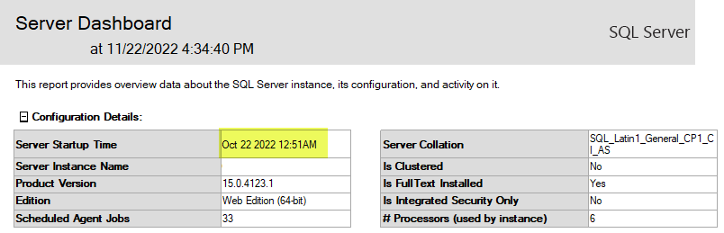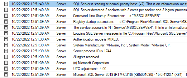 如果在 SSMS 的“ 管理 >”SQL Server 日志下打开当前 SQL Server 错误日志,并滚动到错误日志的底部,则可以看到服务器的启动时间。请注意“SQL Server 正在启动”下方突出显示的文本。您需要查找此内容,以确保错误日志未循环,并给您留下对开始时间的错误印象。