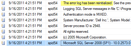 下面是来自其他 SQL Server 实例的循环错误日志的示例,并记下突出显示的文本。如果您看到此内容,则需要查看以前的错误日志,直到找到包含上图中信息的日志。