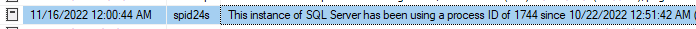 要在 SQL Server 错误日志中查找的另一条消息是“此 SQL Server 实例一直使用进程 ID 为...”这将提供如下日期。如果回收错误日志,此方法将很有帮助。这些消息每天凌晨 12 点左右显示。