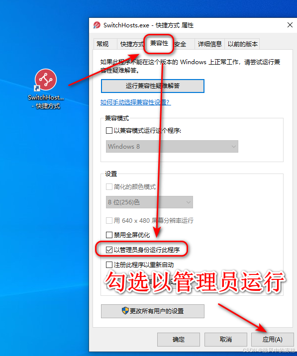 在桌面快捷图标处右键选择属性——兼容性——勾选以管理员身份运行此程序: